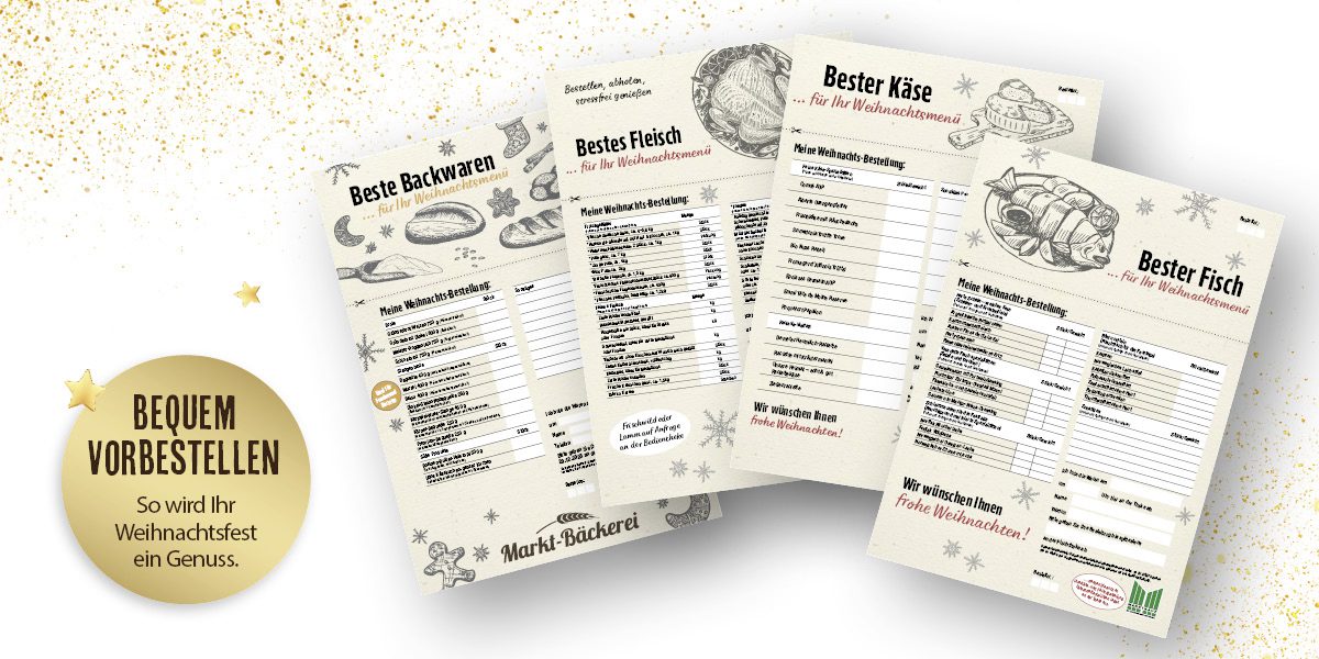 Plane dein Festtagsmenü und bestelle deine Spezialitäten ganz einfach an den Bedientheken vor. Die Listen findest du hier zum Download.